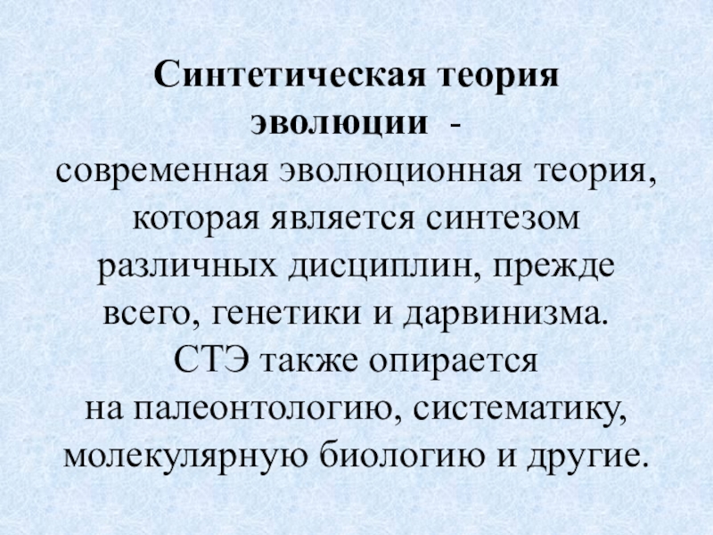 всего, генетики и дарвинизма. СТЭ также опирается на палеонтологию, систематику, молекулярную биологию и другие.
