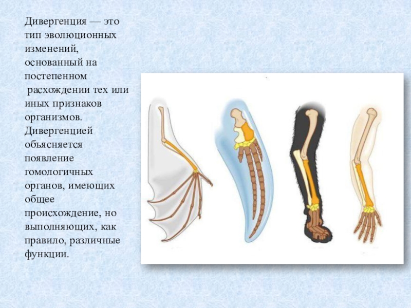признаков организмов. Дивергенцией объясняется появление гомологичных органов, имеющих общее происхождение, но выполняющих, как правило, различные функции.