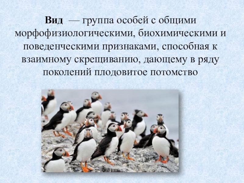 Слайд 4Вид  — группа особей с общими морфофизиологическими, биохимическими и поведенческими признаками, способная к взаимному скрещиванию,