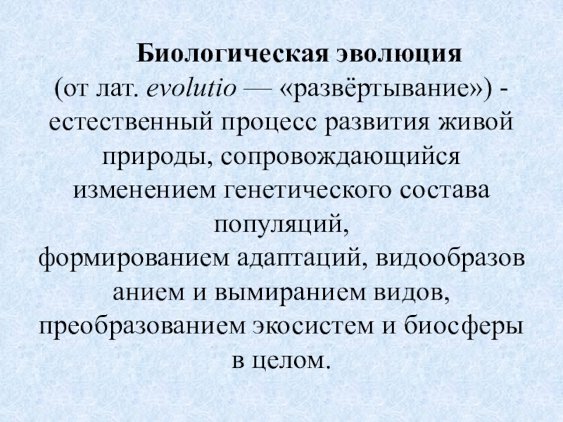 Биологическая эволюция (от лат. evolutio — «развёртывание») - естественный процесс развития живой природы, сопровождающийся изменением генетического состава  популяций, формированием адаптаций, видообразованием и вымиранием видов, преобразованием экосистем и биосферы в целом.