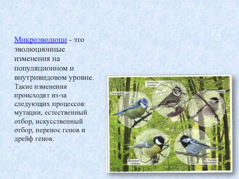 Слайд 5Микроэволюци - это эволюционные изменения на популяционном и внутривидовом уровне. Такие изменения