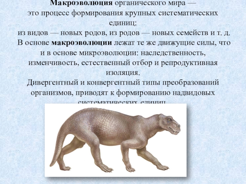 — новых родов, из родов — новых семейств и т. д. В основе макроэволюции лежат те же движущие силы, что и в основе микроэволюции: наследственность, изменчивость, естественный отбор и репродуктивная изоляция. Дивергентный и конвергентный типы преобразований организмов, приводят к формированию надвидовых систематических единиц.