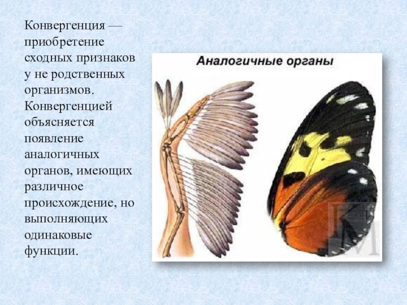 Конвергенция — приобретение сходных признаков у не родственных организмов. Конвергенцией объясняется появление аналогичных органов, имеющих различное происхождение, но