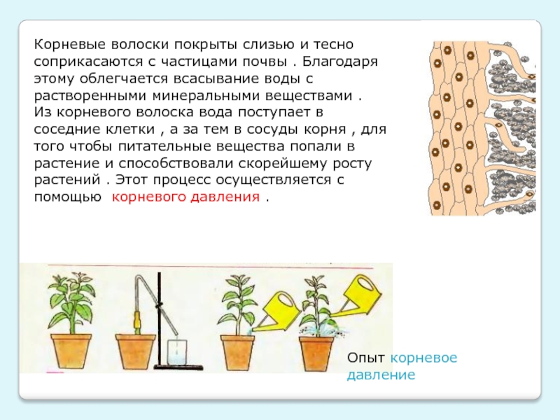 Вода и минеральные соли поступают в растения через корневые волоски .Число корневых волосков очень велико , что значительно увеличивает всасывающую поверхность корня .
