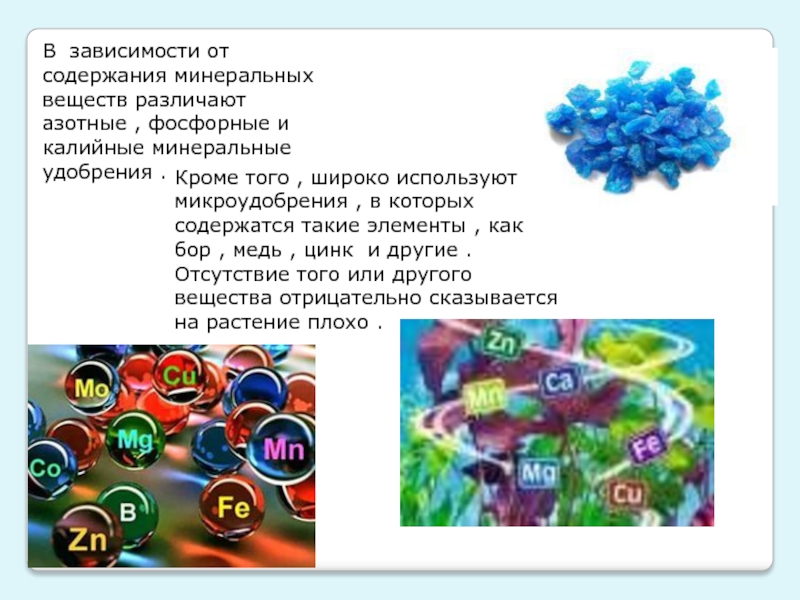 Кроме того , широко используют микроудобрения , в которых содержатся такие элементы , как бор , медь , цинк и другие . Отсутствие того или другого вещества отрицательно сказывается на растение плохо .