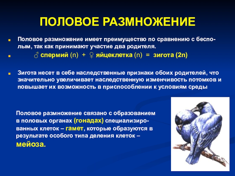Образуется большое количество новых комбинаций генов при кроссинговере и слиянии гамет (комбинативная изменчивость), что дает новый материал для эволюции (потомки отличаются от родителей).