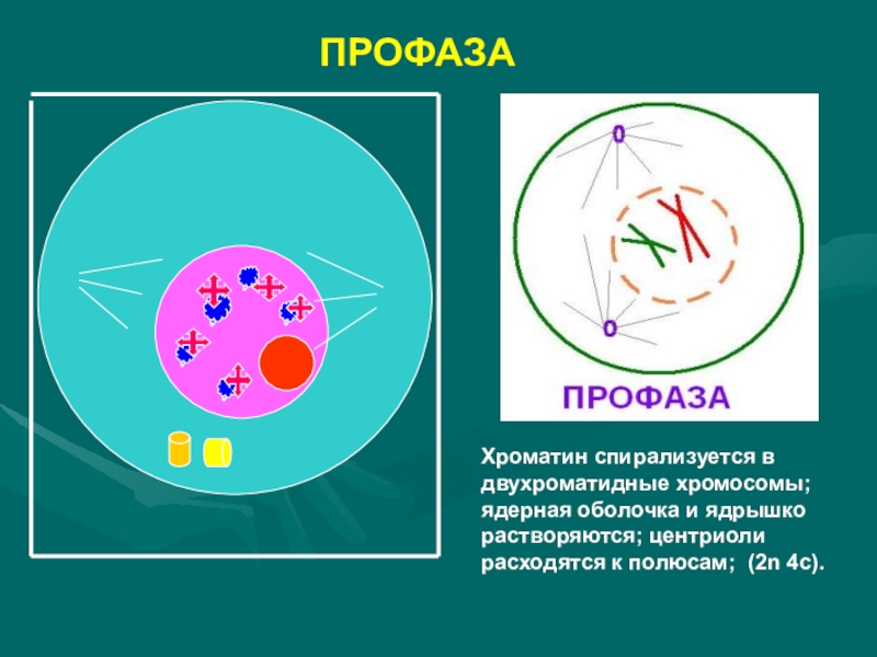 и ядрышко растворяются; центриоли расходятся к полюсам; (2n 4c).