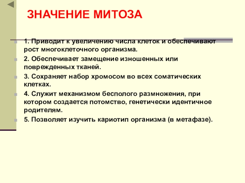 Слайд 17ЗНАЧЕНИЕ МИТОЗА