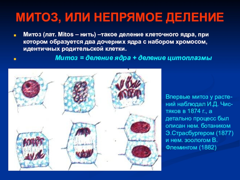 Впервые митоз у расте-ний наблюдал И.Д. Чис-тяков в 1874 г., а детально процесс был описан нем. ботаником Э.Страсбургером (1877) и нем. зоологом В.Флемингом (1882)