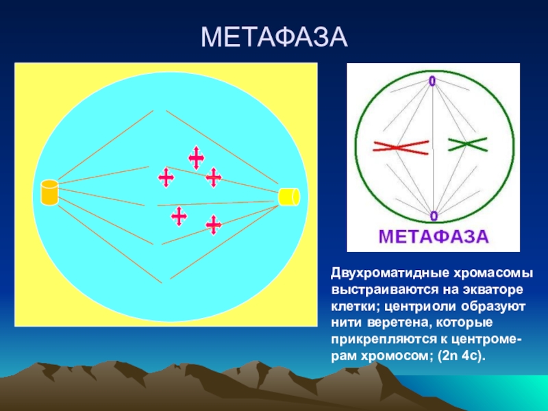 Двухроматидные хромасомы выстраиваются на экваторе клетки; центриоли образуют нити веретена, которые