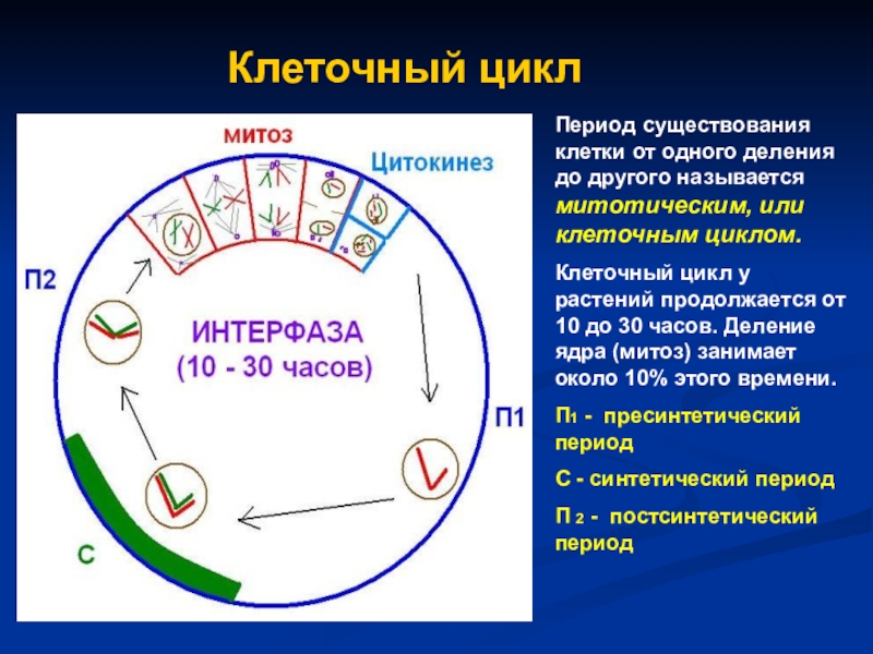 Клеточный цикл у растений продолжается от 10 до 30 часов. Деление ядра (митоз) занимает около 10% этого времени.