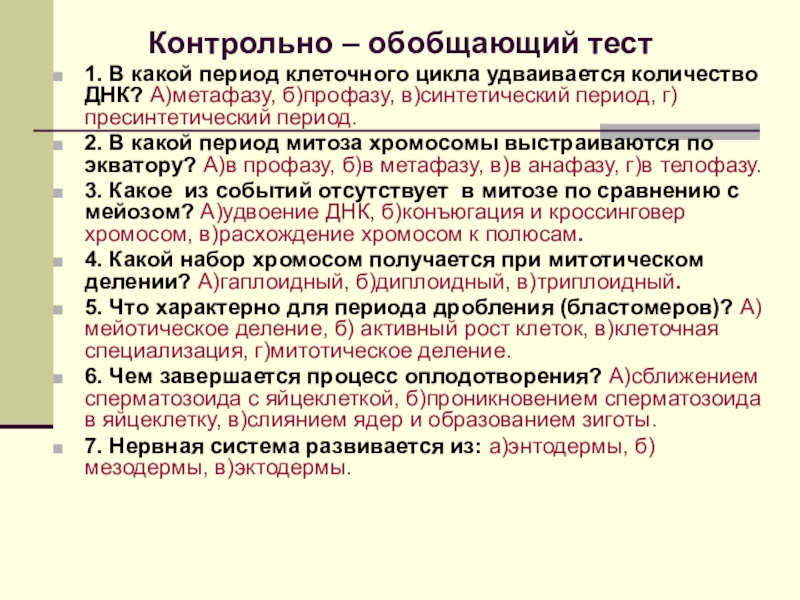 5. Что характерно для периода дробления (бластомеров)? А)мейотическое деление, б) активный рост клеток, в)клеточная специализация, г)митотическое деление.