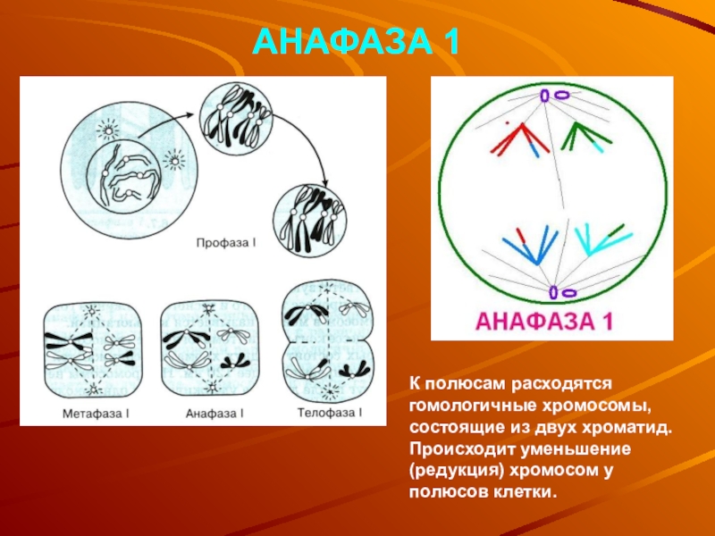 К полюсам расходятся гомологичные хромосомы, состоящие из двух хроматид. Происходит