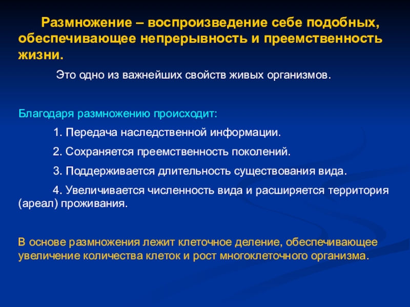 В основе размножения лежит клеточное деление, обеспечивающее увеличение количества клеток и рост многоклеточного организма.