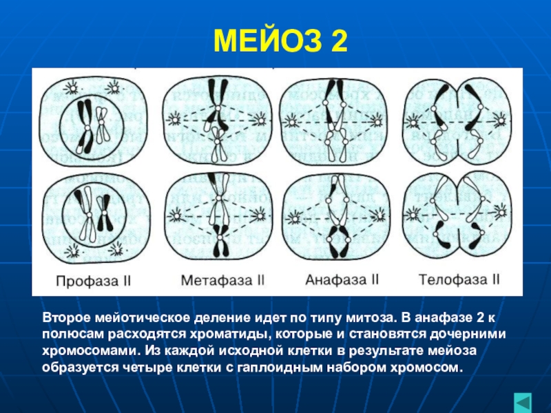 Второе мейотическое деление идет по типу митоза. В анафазе 2