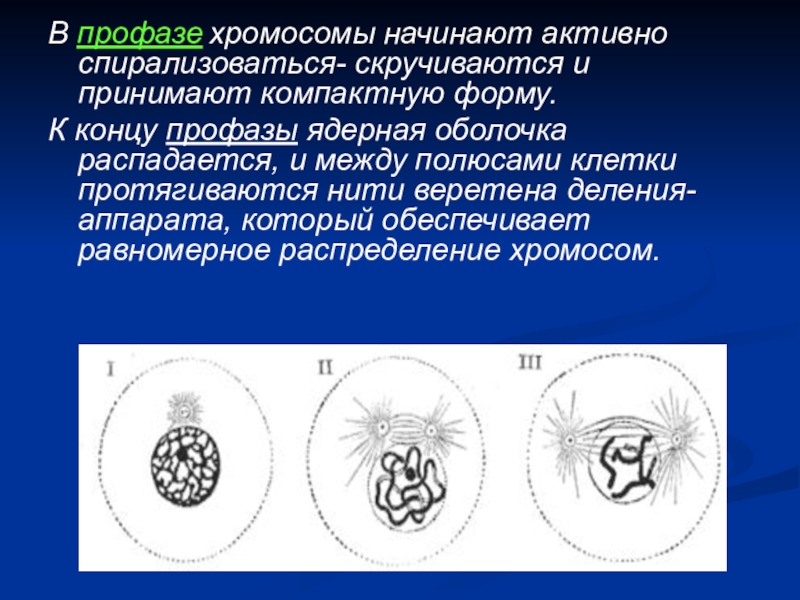 В профазе хромосомы начинают активно спирализоваться- скручиваются и принимают компактную форму.