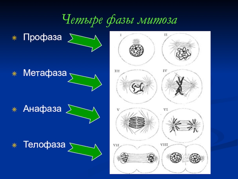 Четыре фазы митозаПрофазаМетафазаАнафазаТелофаза