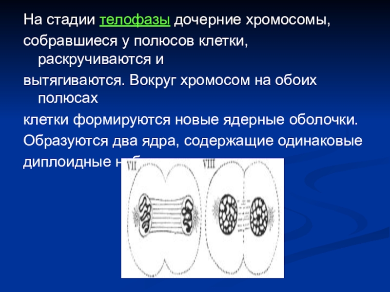 На стадии телофазы дочерние хромосомы, собравшиеся у полюсов клетки, раскручиваются и вытягиваются. Вокруг хромосом на обоих полюсах