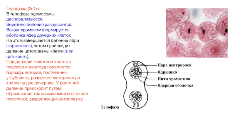 На этом завершается деление ядра (кариокинез), затем происходит деление цитоплазмы клетки (или цитокинез).