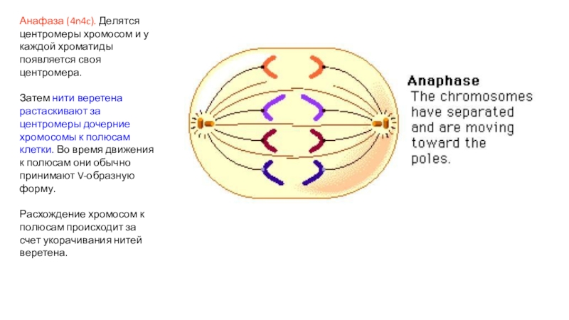 Затем нити веретена растаскивают за центромеры дочерние хромосомы к полюсам клетки. Во время движения к полюсам они обычно принимают V-образную форму.