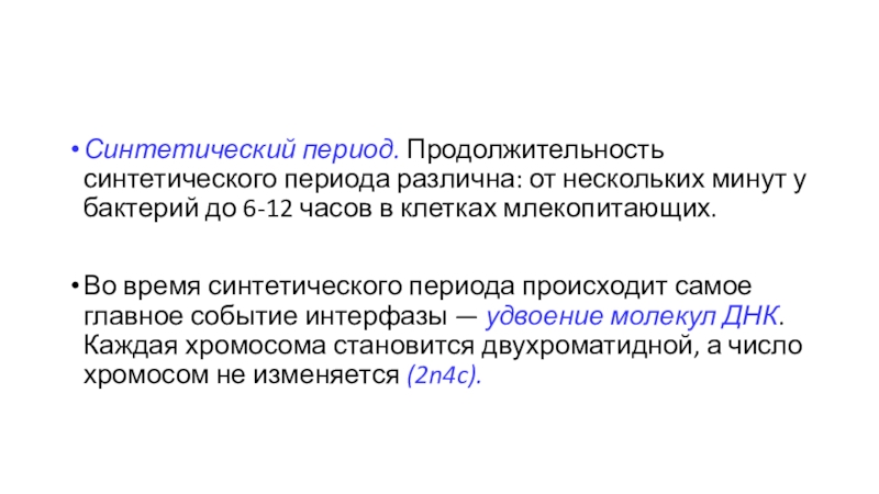 Слайд 3Синтетический период. Продолжительность синтетического периода различна: от нескольких минут у бактерий