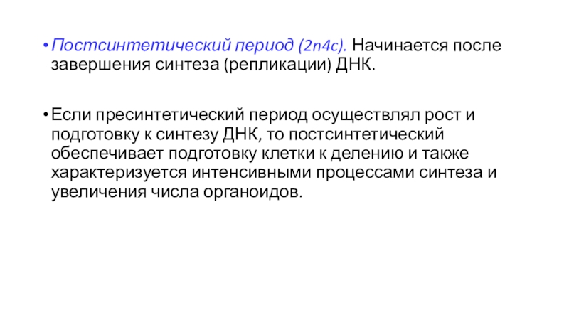 осуществлял рост и подготовку к синтезу ДНК, то постсинтетический обеспечивает подготовку клетки к делению и также характеризуется интенсивными процессами синтеза и увеличения числа органоидов.