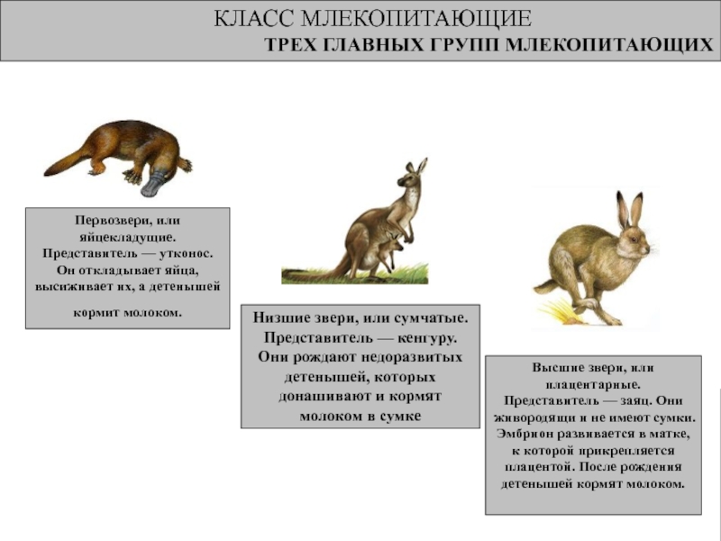 Высшие звери, или плацентарные. Представитель — заяц. Они живородящи и не имеют сумки. Эмбрион развивается в матке, к которой прикрепляется плацентой. После рождения детенышей кормят молоком.