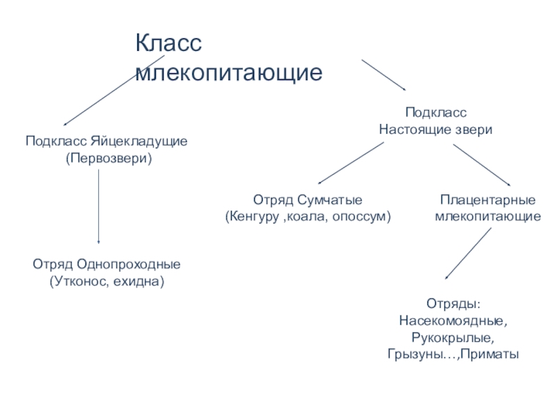 Отряды: Однопроходные, Сумчатые, Насекомоядные, Рукокрылые.