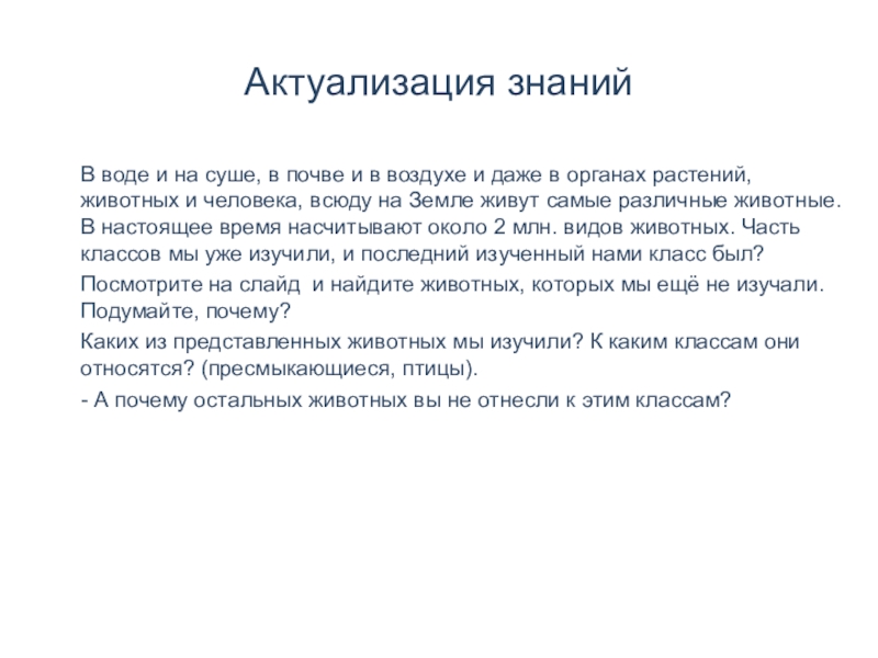 и даже в органах растений, животных и человека, всюду на Земле живут самые различные животные. В настоящее время насчитывают около 2 млн. видов животных. Часть классов мы уже изучили, и последний изученный нами класс был?