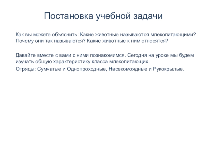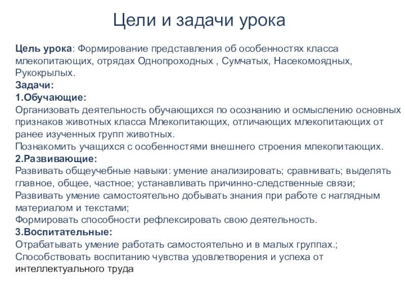 научиться объяснять значение понятий: первозвери или яйцекладущие, настоящие звери, характеризовать особенности внешнего и внутреннего строения млекопитающих; классифицировать млекопитающих; выделять существенные признаки млекопитающих, принадлежащих к отрядам Сумчатые, Насекомоядные, Рукокрылые; различать представителей данных отрядов на рисунках, фотографиях и среди натуральных объектов; оценивать роль млекопитающих данных отрядов в природе и в жизни человека.