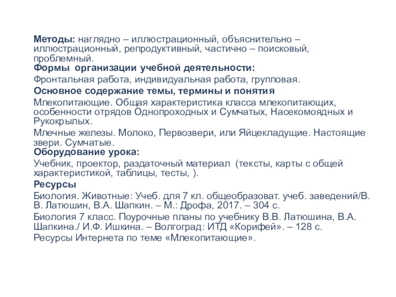 Цель урока: Формирование представления об особенностях класса млекопитающих,