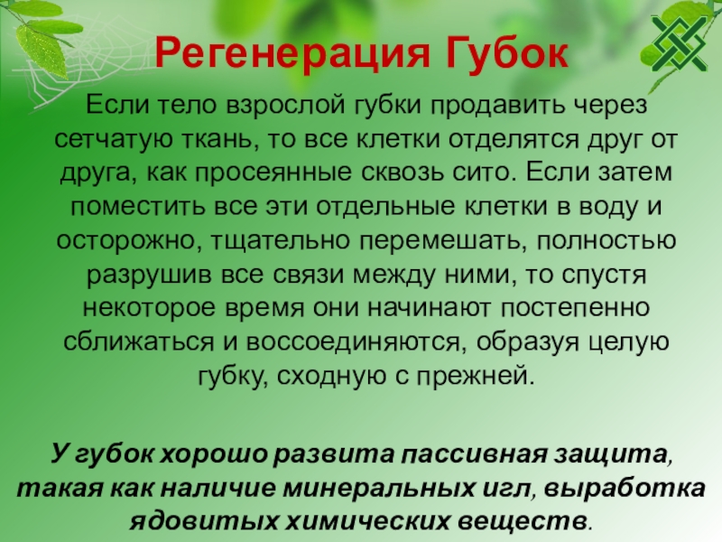 У губок хорошо развита пассивная защита, такая как наличие минеральных игл, выработка ядовитых химических веществ.