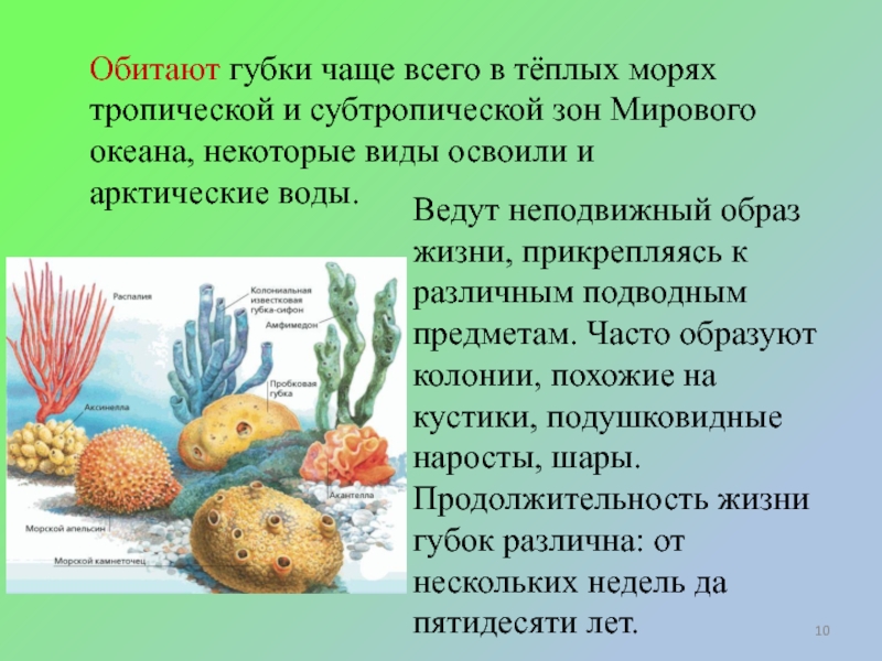 Ведут неподвижный образ жизни, прикрепляясь к различным подводным предметам. Часто образуют колонии, похожие на кустики, подушковидные наросты, шары. Продолжительность жизни губок различна: от нескольких недель да пятидесяти лет.