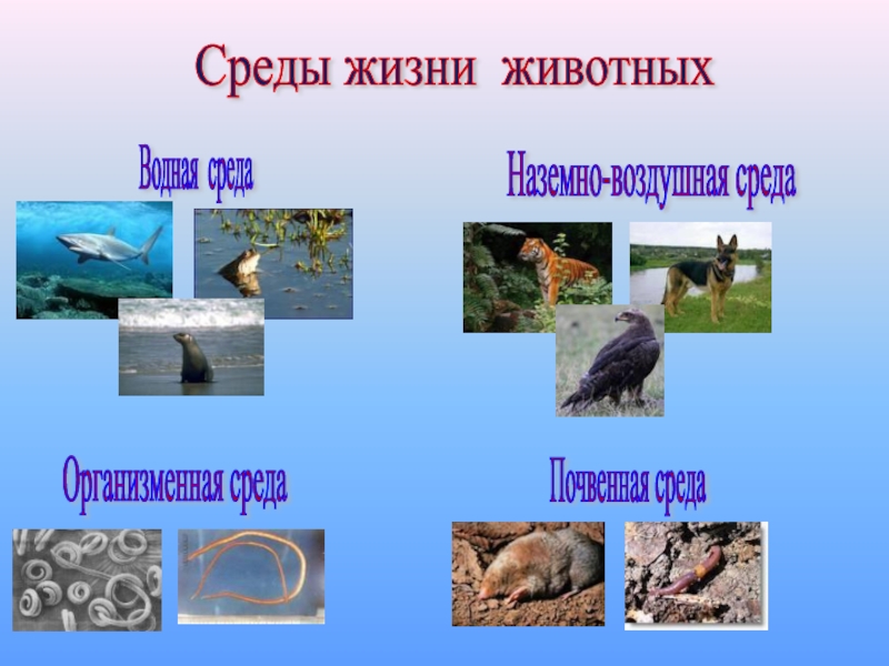 Среды жизни животных Водная среда Наземно-воздушная среда Почвенная среда Организменная среда