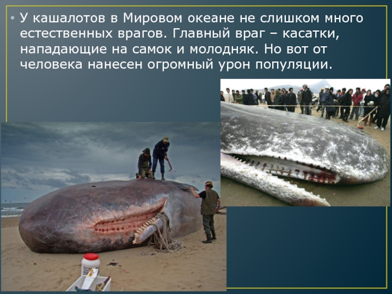 Слайд 14У кашалотов в Мировом океане не слишком много естественных врагов. Главный