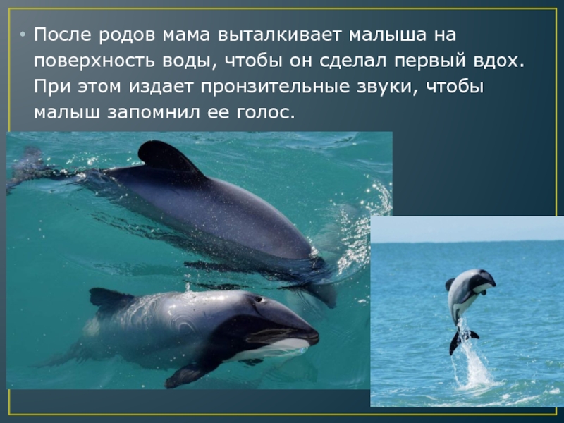 Слайд 8После родов мама выталкивает малыша на поверхность воды, чтобы он сделал