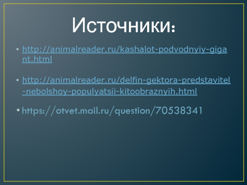 Источники:http://animalreader.ru/kashalot-podvodnyiy-gigant.htmlhttp://animalreader.ru/delfin-gektora-predstavitel-nebolshoy-populyatsii-kitoobraznyih.htmlhttps://otvet.mail.ru/question/70538341