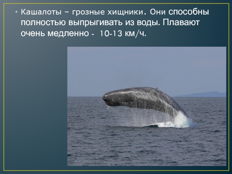Слайд 12Кашалоты – грозные хищники. Они способны полностью выпрыгивать из воды. Плавают