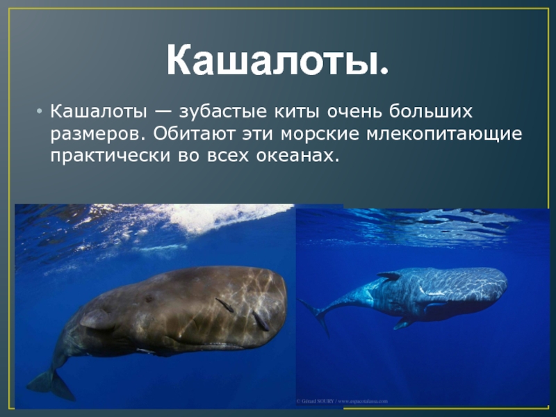 Кашалоты.Кашалоты — зубастые киты очень больших размеров. Обитают эти морские млекопитающие практически во всех океанах.