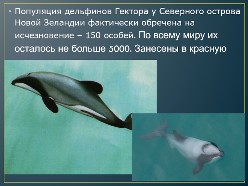 Слайд 6Популяция дельфинов Гектора у Северного острова Новой Зеландии фактически обречена на