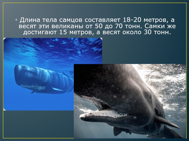 Длина тела самцов составляет 18-20 метров, а весят эти великаны от