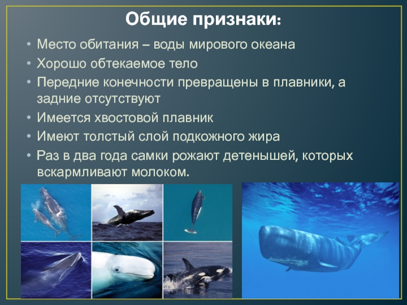 Общие признаки:Место обитания – воды мирового океанаХорошо обтекаемое телоПередние конечности превращены в плавники, а задние отсутствуютИмеется хвостовой