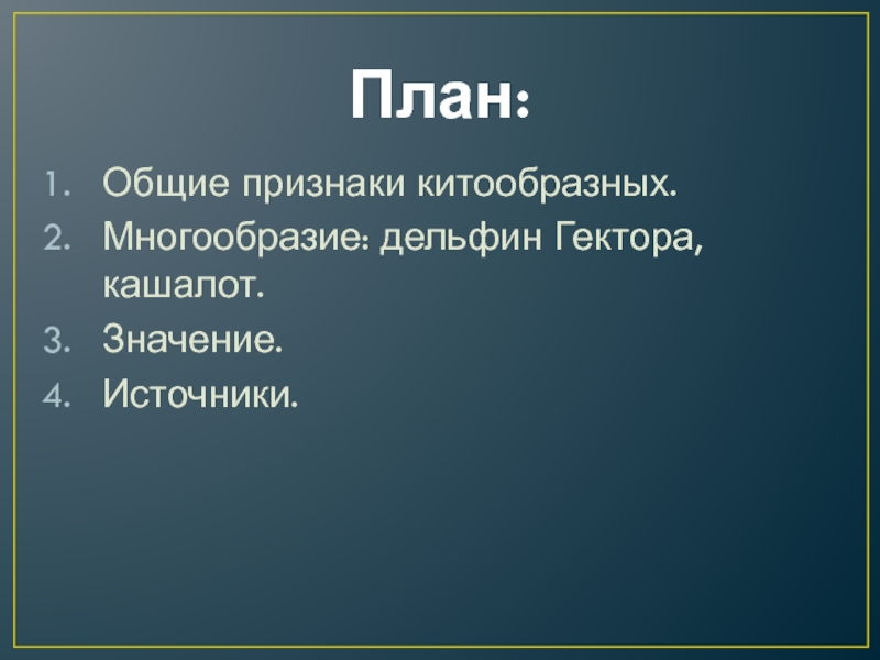 План:Общие признаки китообразных.Многообразие: дельфин Гектора, кашалот.Значение.Источники.