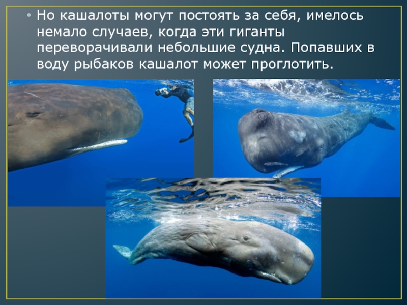 Слайд 15Но кашалоты могут постоять за себя, имелось немало случаев, когда эти