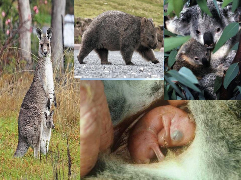 Сумчатые – Млекопитающие, у которых детёныши рожаются очень маленькими, слабыми и беспомощными. Поэтому долгое время такого детёныша мать донашивает в сумке на брюхе. К Сумчатым относятся: опоссумы, кенгуру, сумчатый (тасманийский) волк, сумчатая куница – бандикут, коала, сумчатый летун, сумчатый муравьед и др. Сумчатые обладают рядом своеобразных черт.