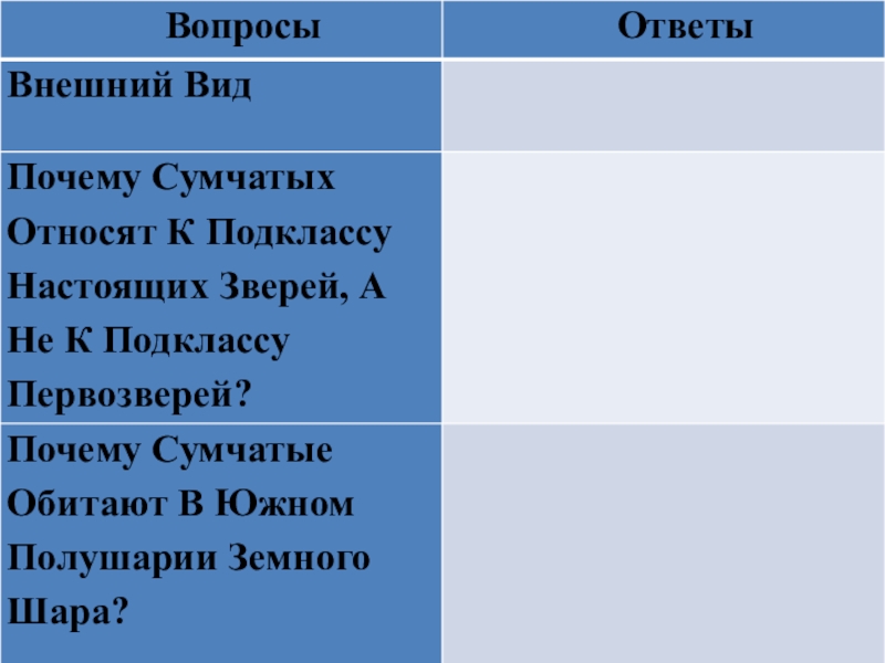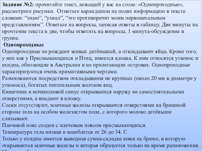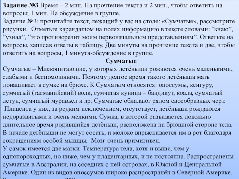 Задание №3: прочитайте текст, лежащий у вас на столе: «Сумчатые», рассмотрите рисунки. Отметьте карандашом на полях информацию в тексте словами: “знаю”, “узнал”, “это противоречит моим первоначальным представлениям”. Ответьте на вопросы, записав ответы в таблицу. Две минуты на прочтение текста и две, чтобы ответить на вопросы, 1 минута-обсуждение в группе.