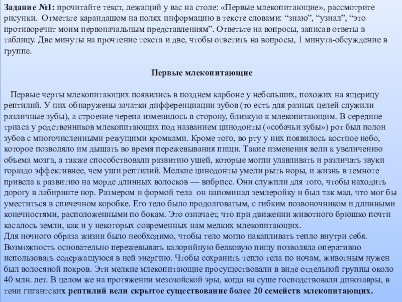 Слайд 27Задание №1: прочитайте текст, лежащий у вас на столе: «Первые млекопитающие»,
