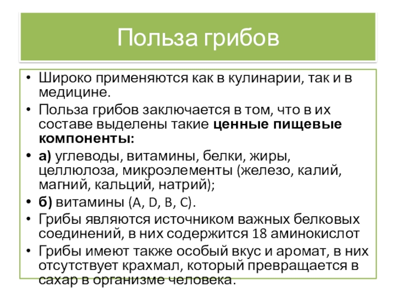 Грибы являются источником важных белковых соединений, в них содержится 18 аминокислот