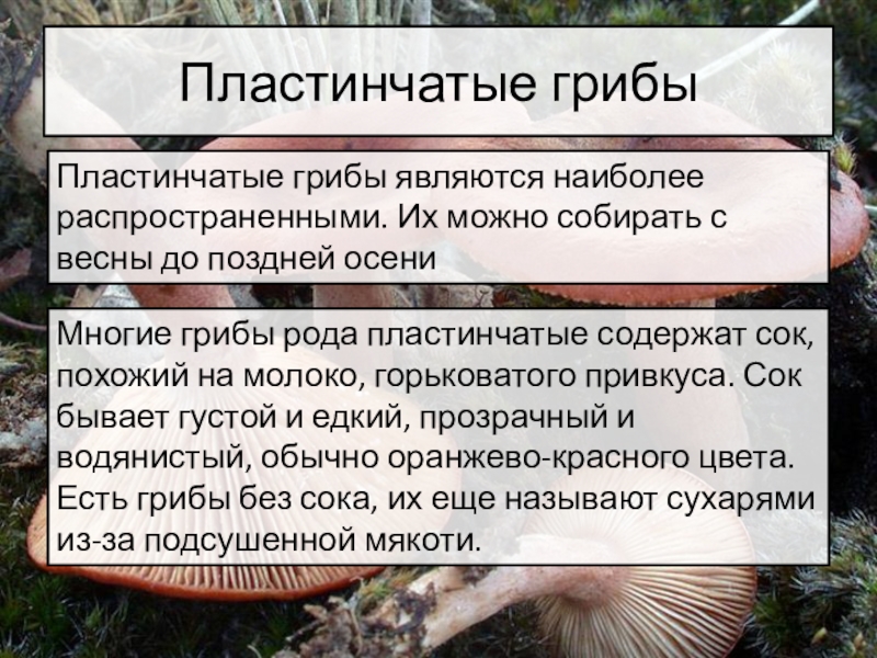 Многие грибы рода пластинчатые содержат сок, похожий на молоко, горьковатого привкуса. Сок бывает густой и едкий, прозрачный и водянистый, обычно оранжево-красного цвета. Есть грибы без сока, их еще называют сухарями из-за подсушенной мякоти.