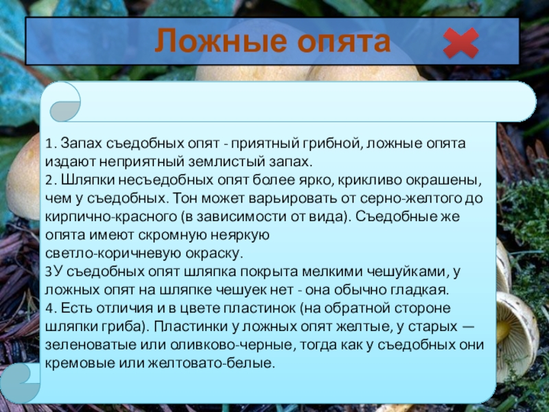 1. Запах съедобных опят - приятный грибной, ложные опята издают